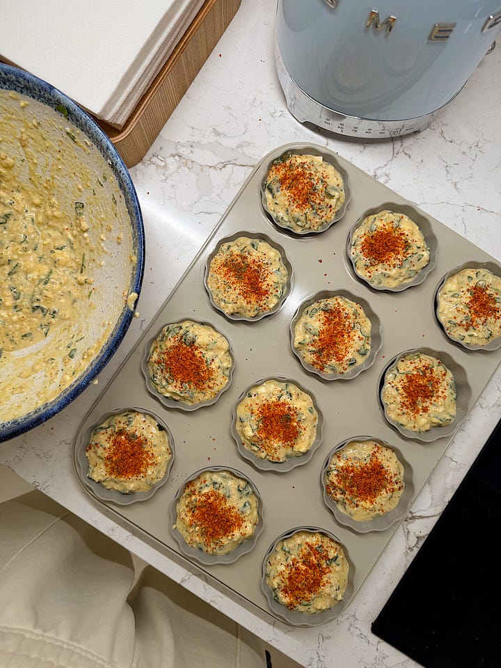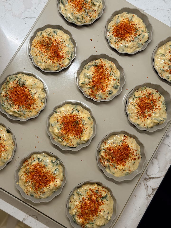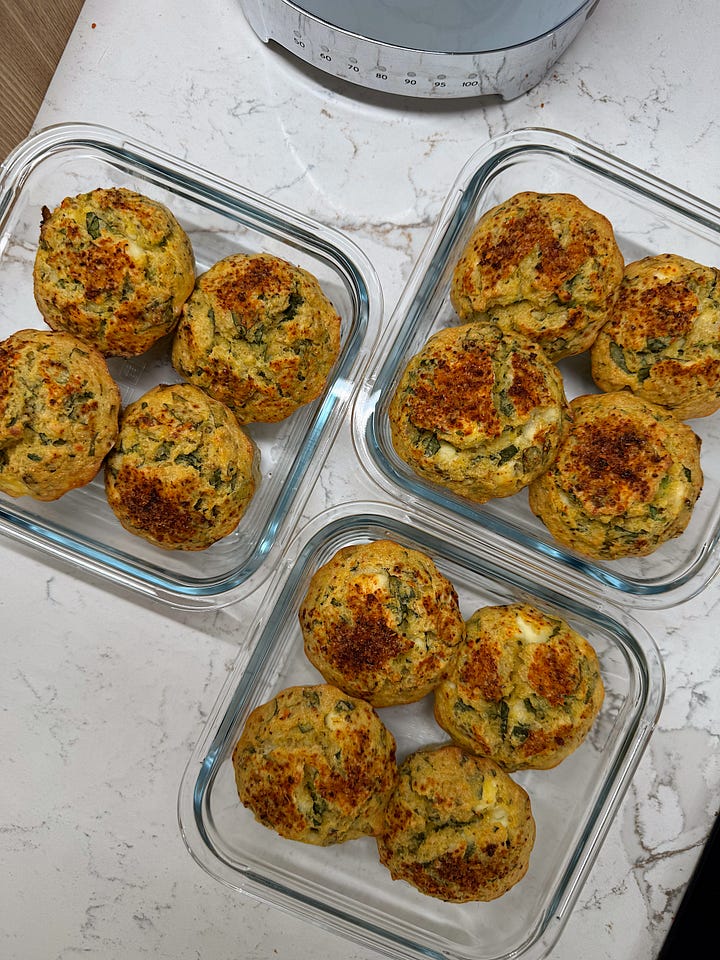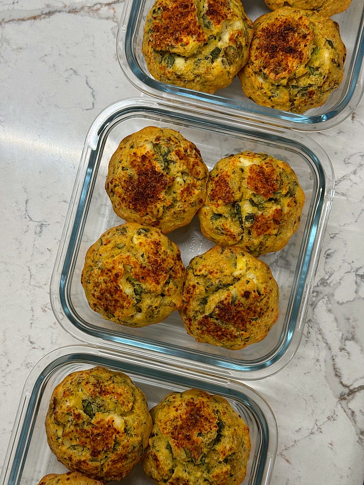 Macros (per muffin): ~140 kcal | 7 g protein | 9 g carbs | 8 g fat
