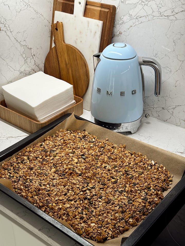 Spread the mixture onto the prepared tray in an even layer. Bake for 25 to 30 minutes, stirring once halfway through. Start checking around the 20-minute mark, as it can brown quickly. Let it cool completely before storing, it will crisp up as it cools.
