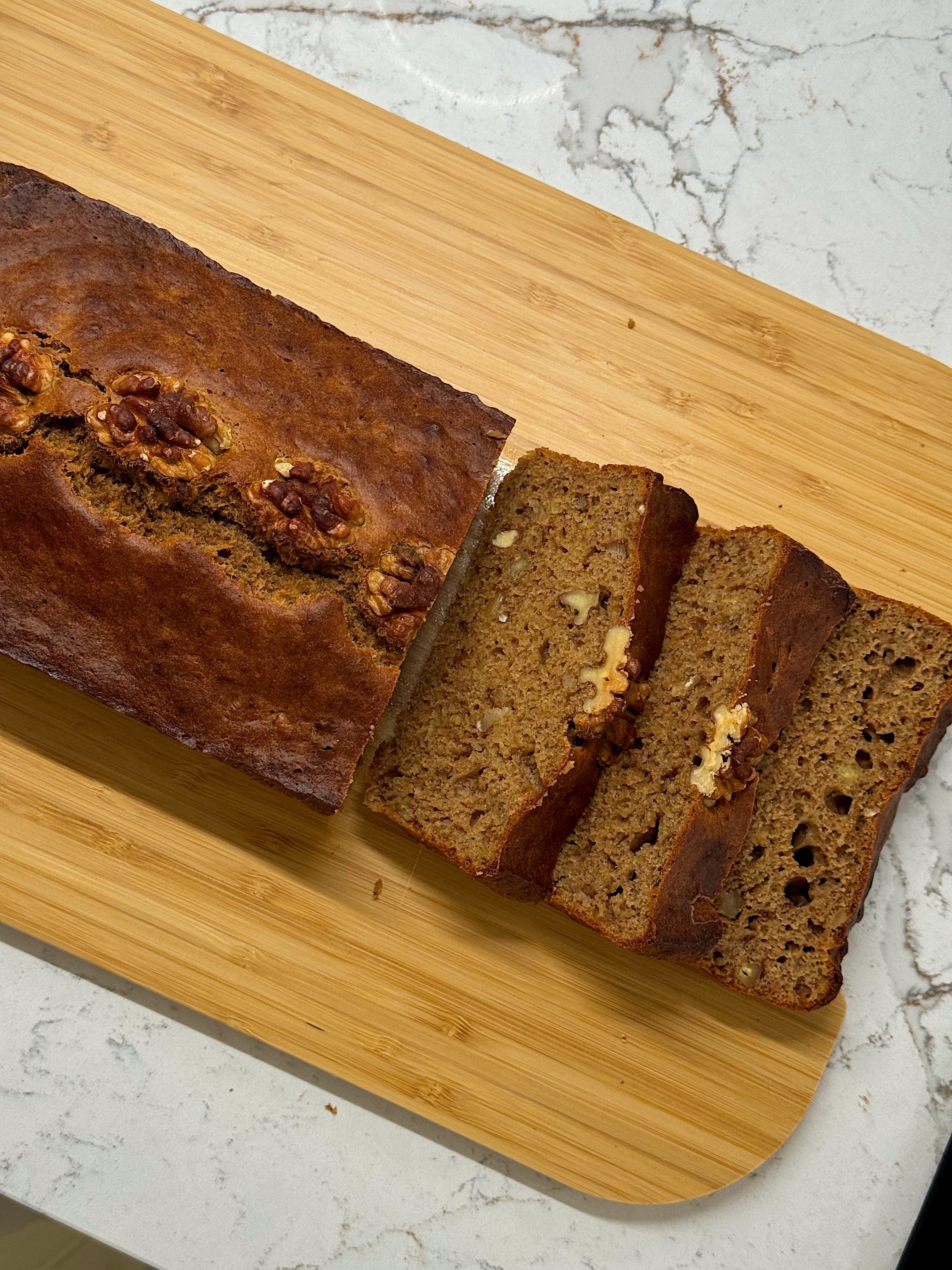 Lightly grease a baking dish, pour in the batter, and top with extra walnuts. Bake for about 35 minutes, or until a toothpick comes out mostly clean. Let cool completely before slicing. Store in the fridge for up to one week.