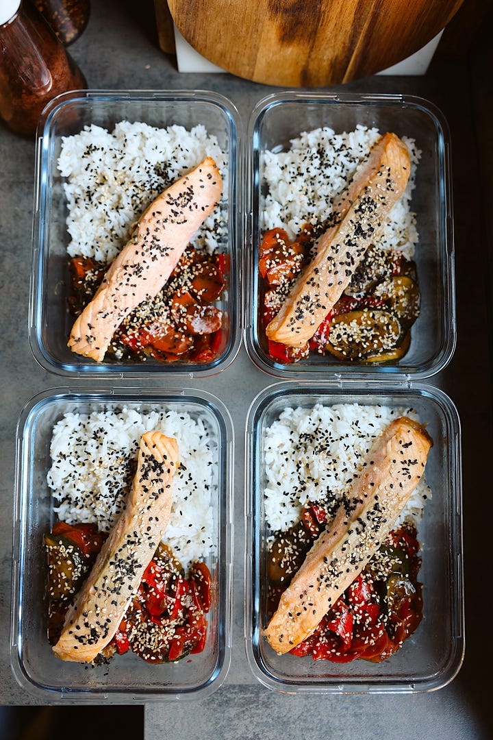 Assemble the bowl with rice, saucy vegetables, and salmon on top.