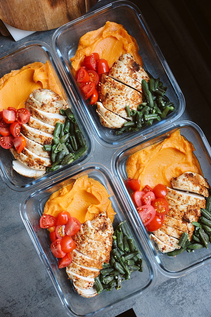 Chop cherry tomatoes in half and assemble each bowl with sweet potato purée, chicken, green beans, and tomatoes.